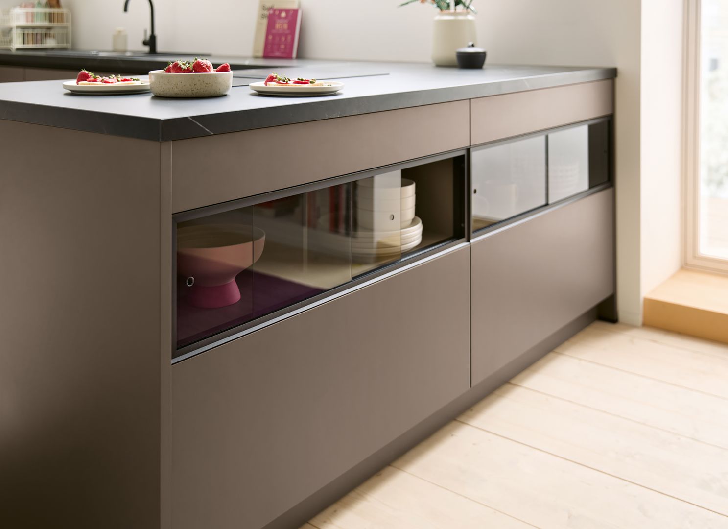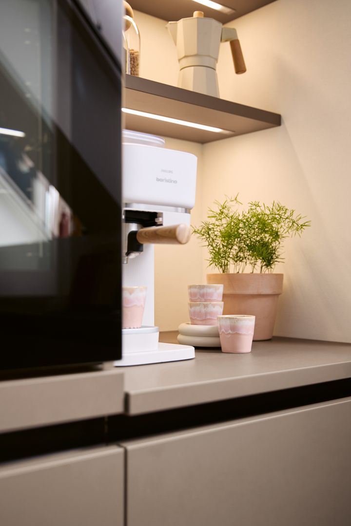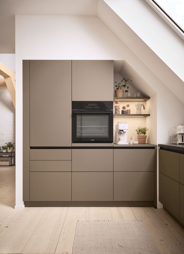 Die wandhängenden Schränke in warmem Sepiabraun schaffen eine leichte Atmosphäre und bieten ausreichend Stauraum. Mit dem Blick über die Stadt im Apartment mit Dachschräge duftet es morgens nach Kaffee – zubereitet auf der dunkel, edlen Arbeitsplatte in Marmor nero Nachbildung in einer Kaffeetasse aus dem Regal mit Glasschiebetür. Offenheit und Leichtigkeit strahlt die schräg eingepasste Küche aus und lädt zu spannenden Gesprächen um die Küchen-Halbinsel herum ein. Durch die Tip-On-Mechanik lassen sich Auszüge und Türen auch mit vollen Händen öffnen – das Highlight: die nachhaltige Front in Matera Colour mit Anti-Fingerprint-Eigenschaft hinterlässt keine Spuren vom Öffnen oder Schließen der Schränke.
